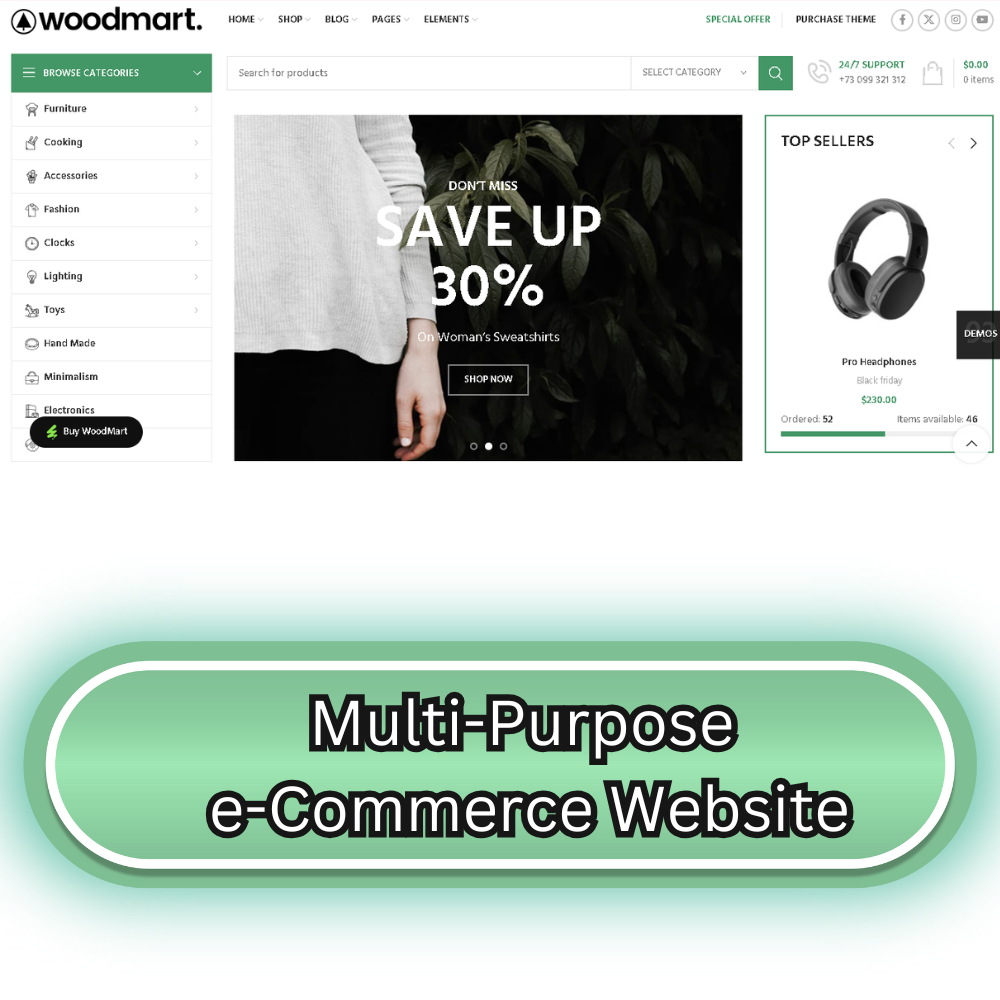 The Multi-Purpose e-Commerce Website Template is a highly flexible WooCommerce theme built for entrepreneurs, startups, and stores that sell a wide variety of products. Whether you’re launching a fashion store, gadget shop, home goods outlet, or a bit of everything — this template has you covered.